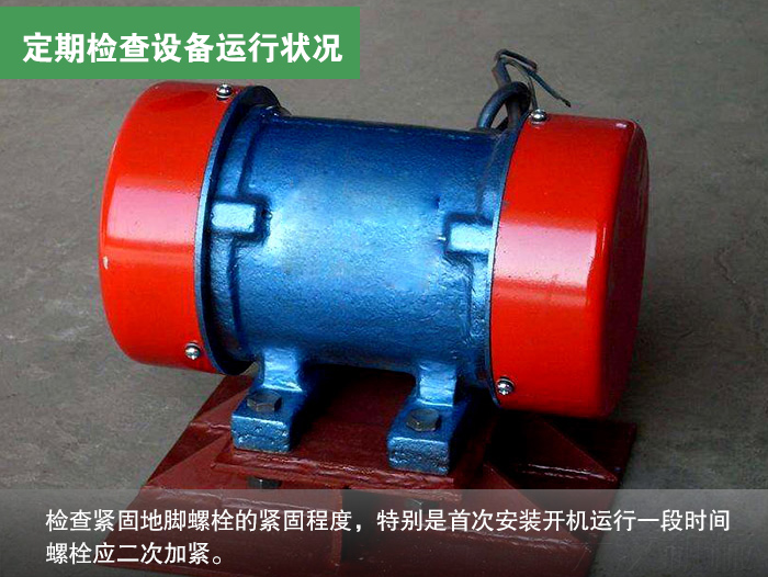 需要定期對(duì)倉(cāng)壁振動(dòng)器進(jìn)行運(yùn)行檢查,仔細(xì)查看整個(gè)設(shè)備在運(yùn)行時(shí)是否會(huì)發(fā)出異常響聲,如果發(fā)現(xiàn)問(wèn)題必須馬上關(guān)閉電源查看問(wèn)題源頭出在哪里,同時(shí)檢查緊固地腳螺栓的緊固程度,特別是初次安裝開機(jī)運(yùn)行一段時(shí)間螺栓應(yīng)二次加緊。