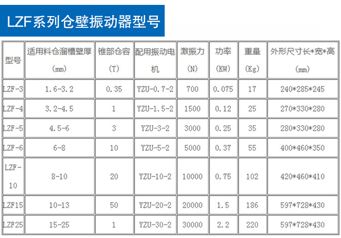 主要型號(hào)有LZF-3、LZF-4、LZF-6、LZF-8、LZF-10、LZF-12、LZF-15、LZF-25、LZF-40等不同型號(hào),型號(hào)大小不同其激振力、功率以及外形尺寸都是不同的。